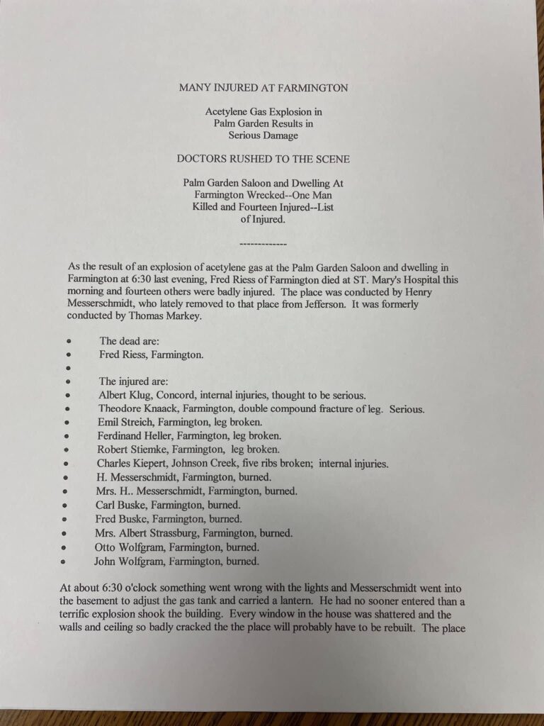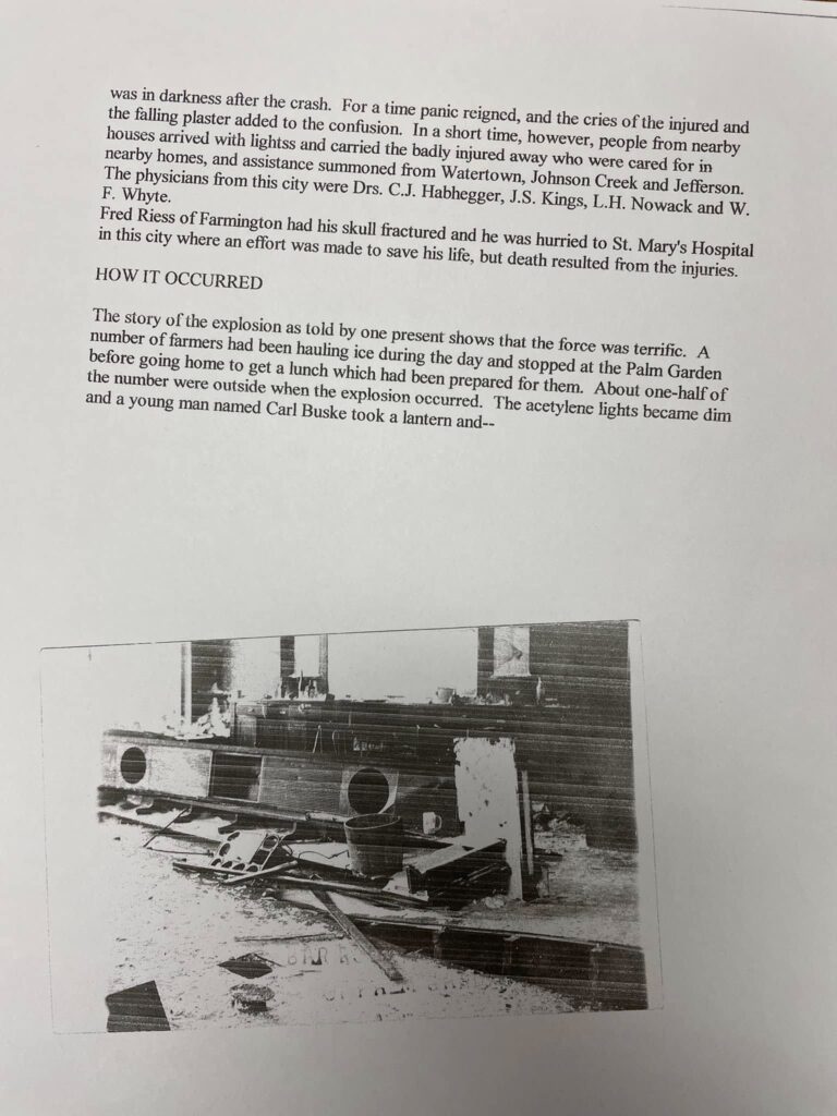 In these photos you will see the Palm Garden Saloon & Inn which was a hot spot for travelers and locals alike. Unfortunately, due to an acetylene gas explosion (January 1910) in which Fred Riess died, and fourteen others were badly injured. The new owner Mr. Messerschmidt had gone to the basement to retore lights by adjusting the gas, he had just entered the basement with a lantern when the building exploding blowing out all the windows. Neighbors quickly responded and doctors from Johnson Creek, Watertown and Jefferson responded taking the injured to St. Mary’s Hospital.